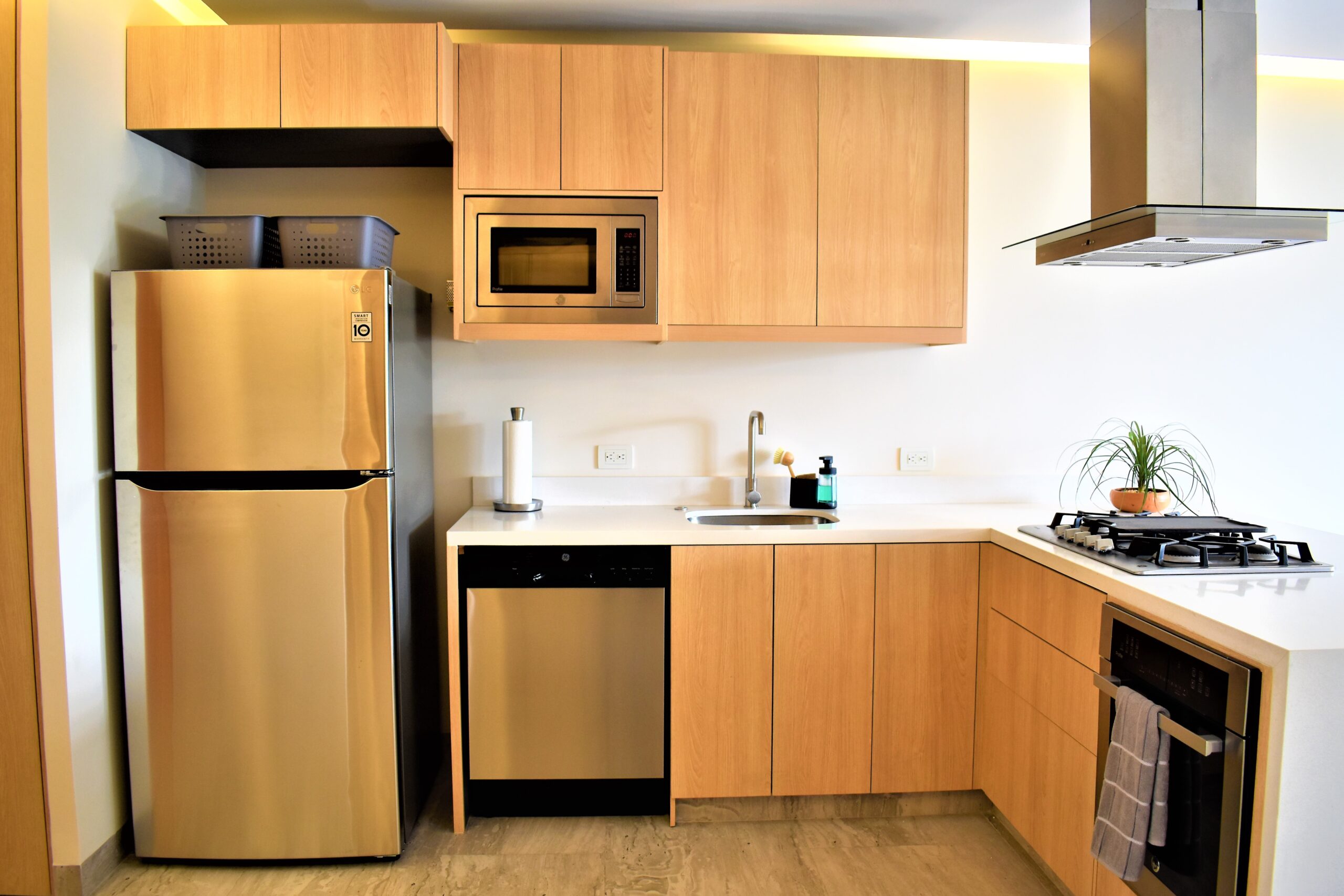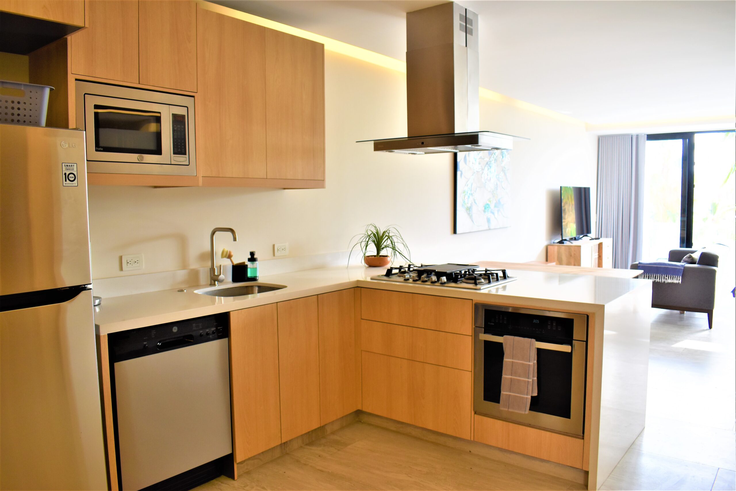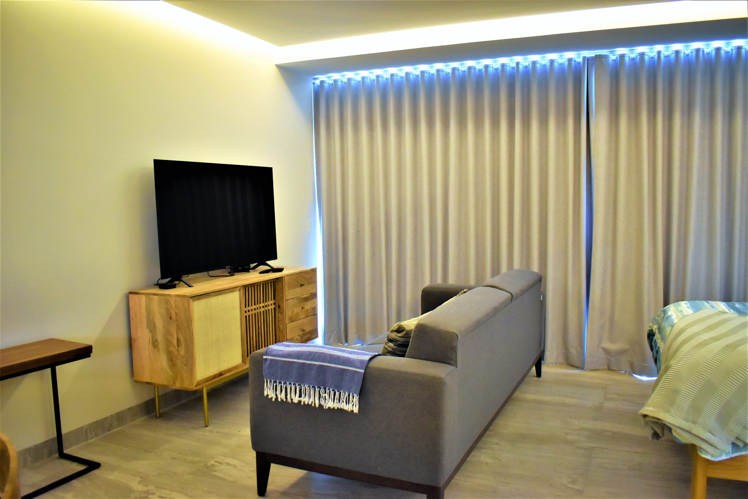 The living area is bright and airy. The sofa is perfect for relaxing. The kitchen is fully equipped. The bedroom is cozy with a premium Queen mattress. Underground parking is provided.