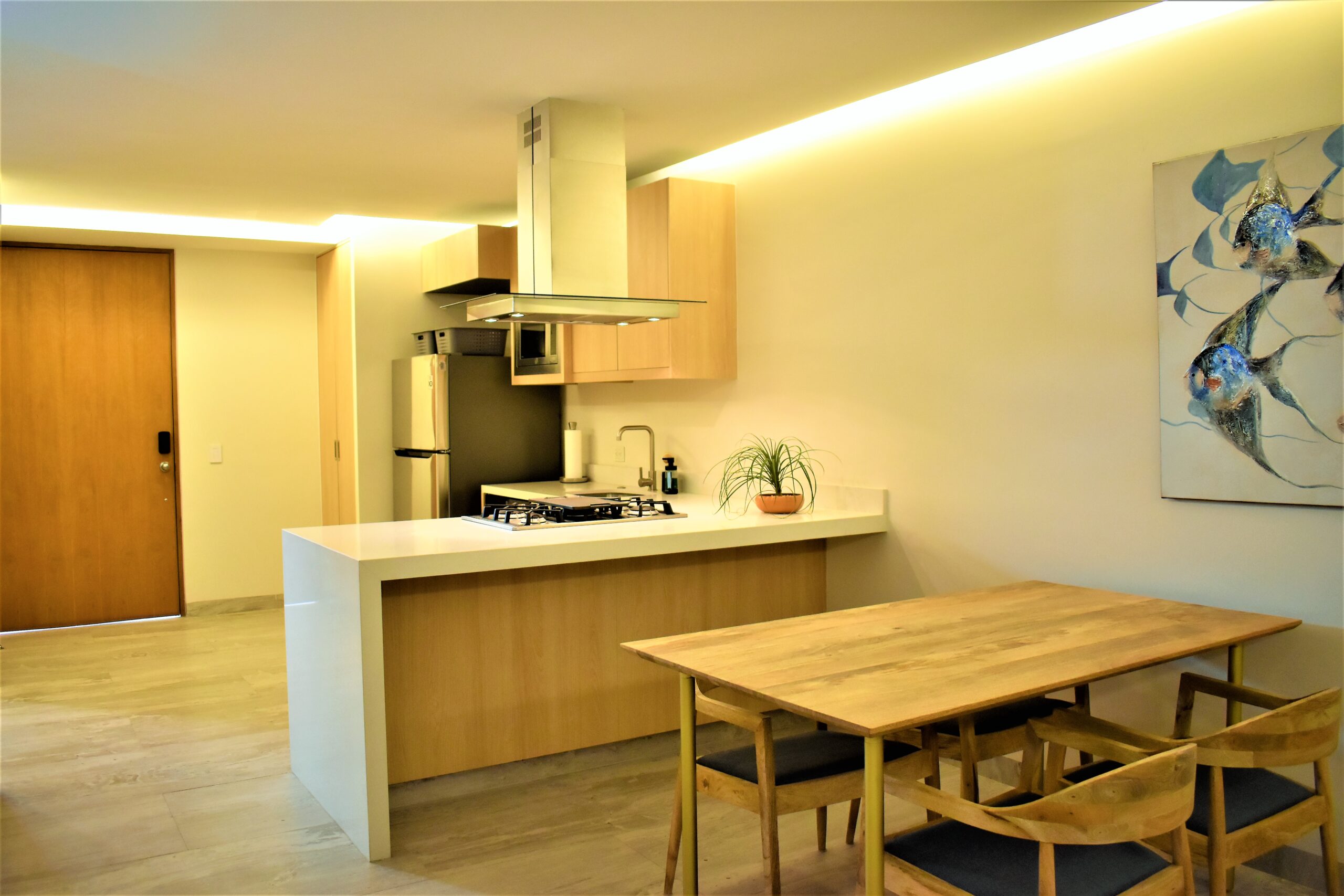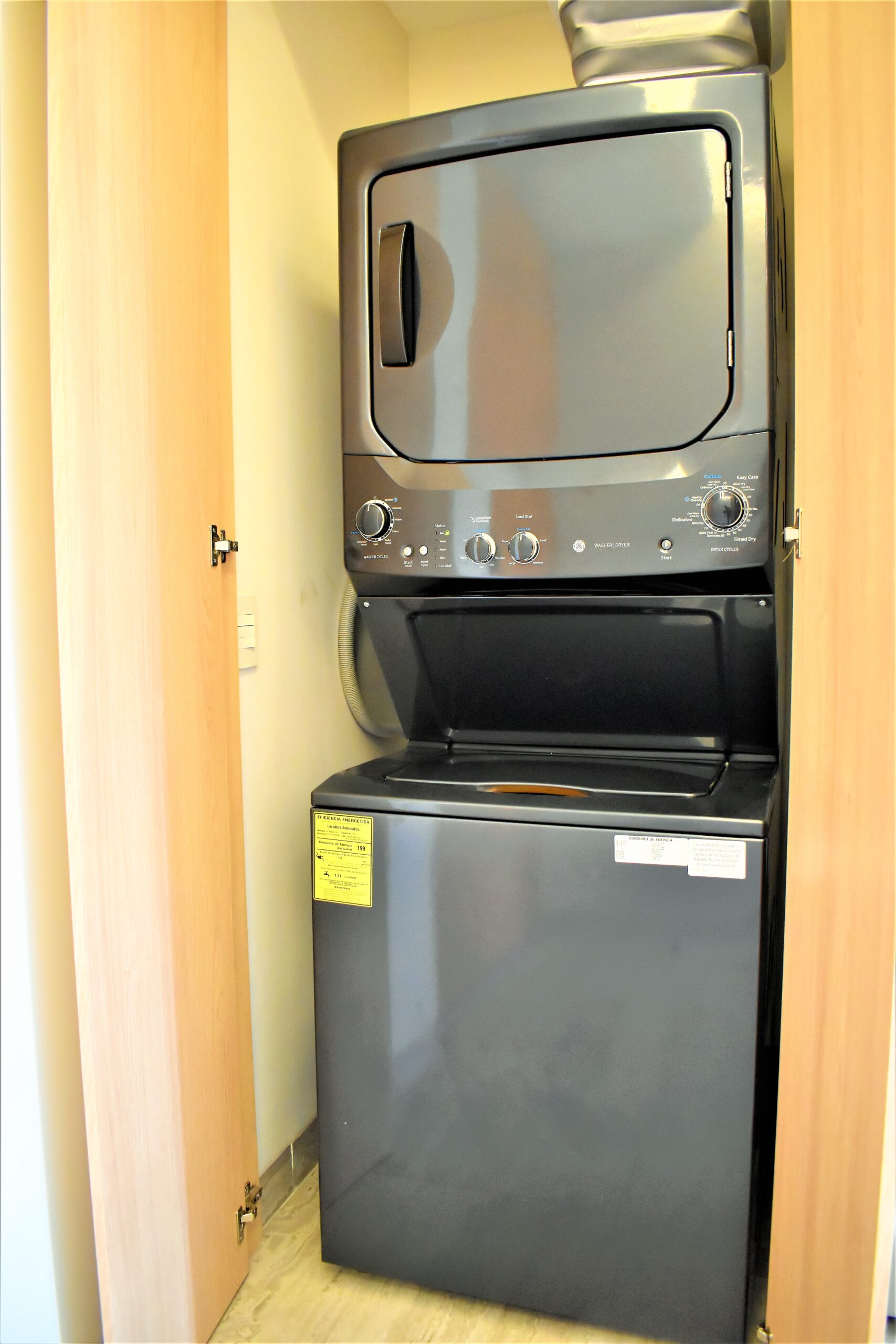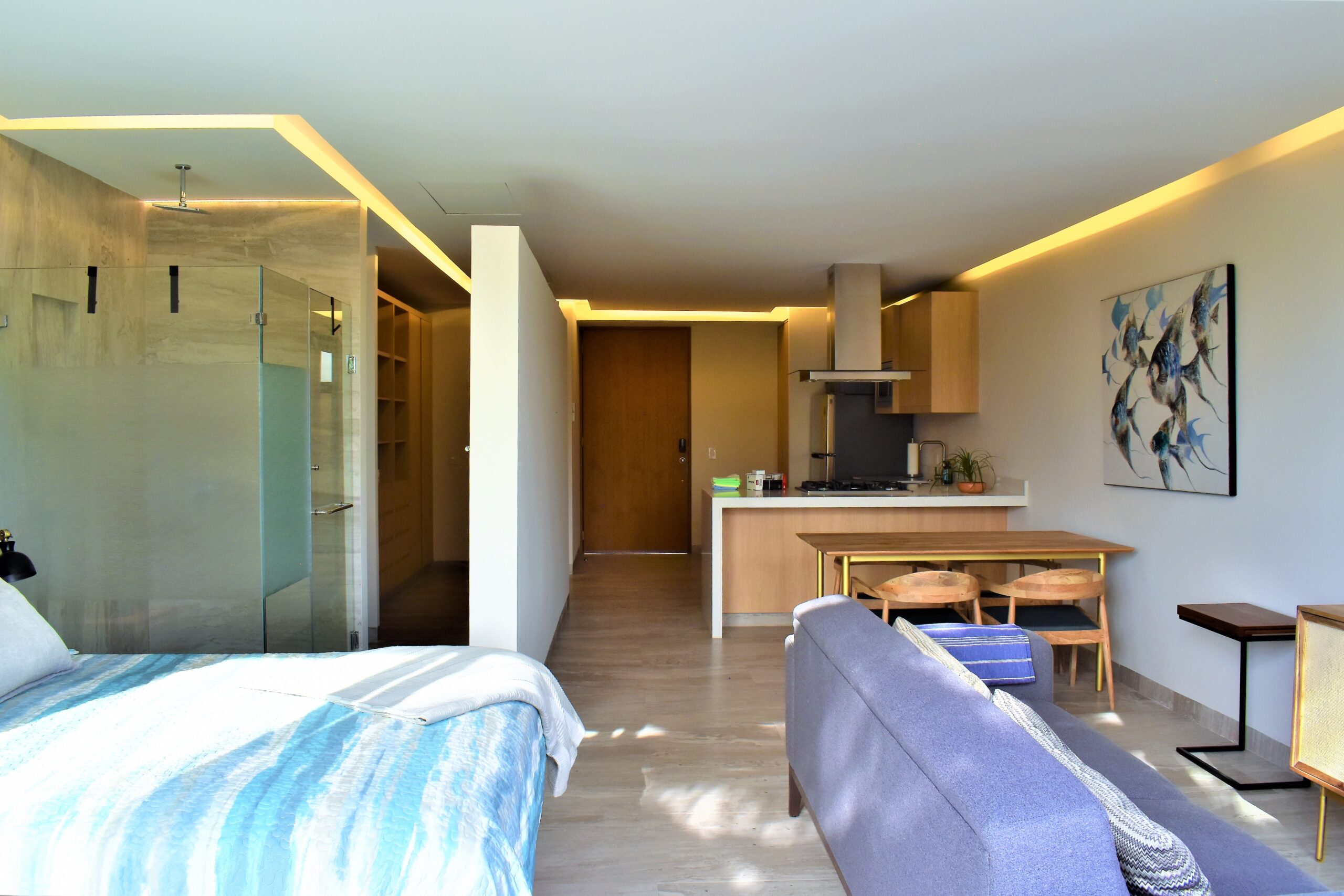 The living area is bright and airy. The sofa is perfect for relaxing. The kitchen is fully equipped. The bedroom is cozy with a premium Queen mattress. Underground parking is provided.